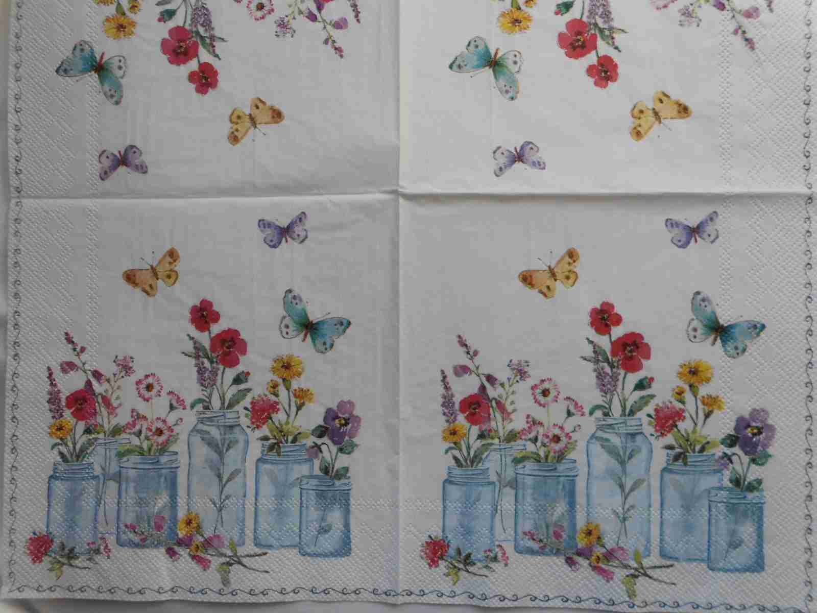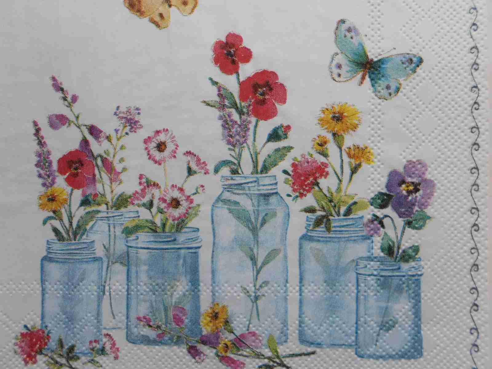 Glass jars with flowers butterflies decoupage paper napkins. Size Lunch (33x33cm or 13 x 13 inches), 3 ply, quantity: 1 sheet