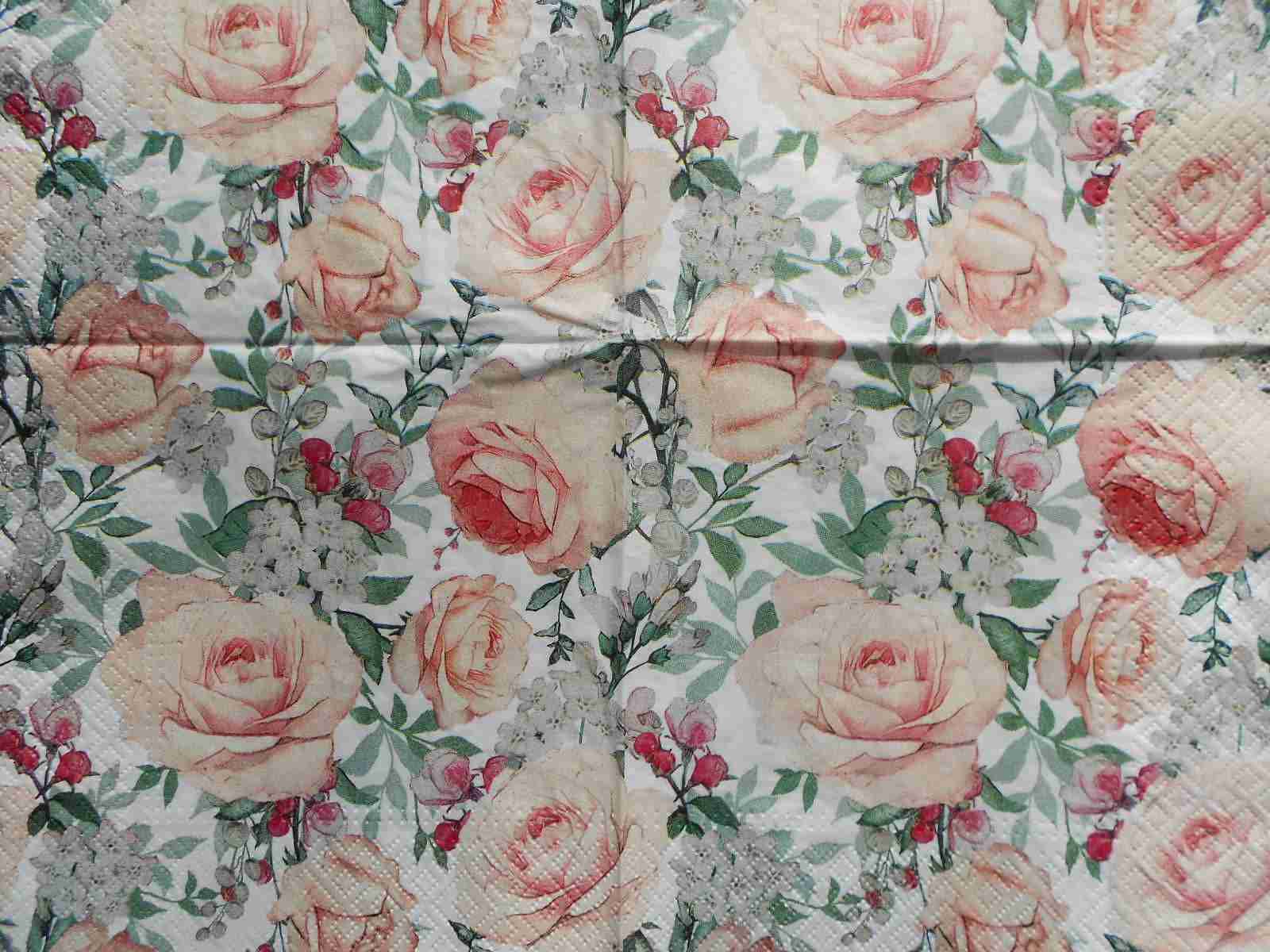 Pale cabbage roses decoupage paper napkins, wallpaper style. Size Lunch (33x33cm or 13 x 13 inches), 3 ply, quantity: 1 sheet