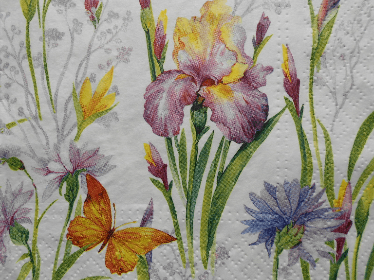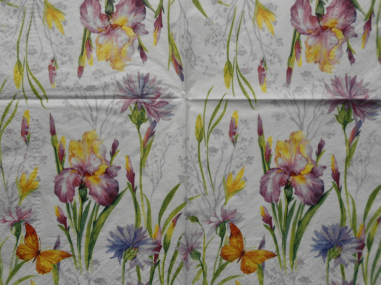 Purple yellow irises butterfly cornflower decoupage paper napkins. Size Lunch (33x33cm or 13 x 13 inches), 3 ply, quantity: 1 sheet