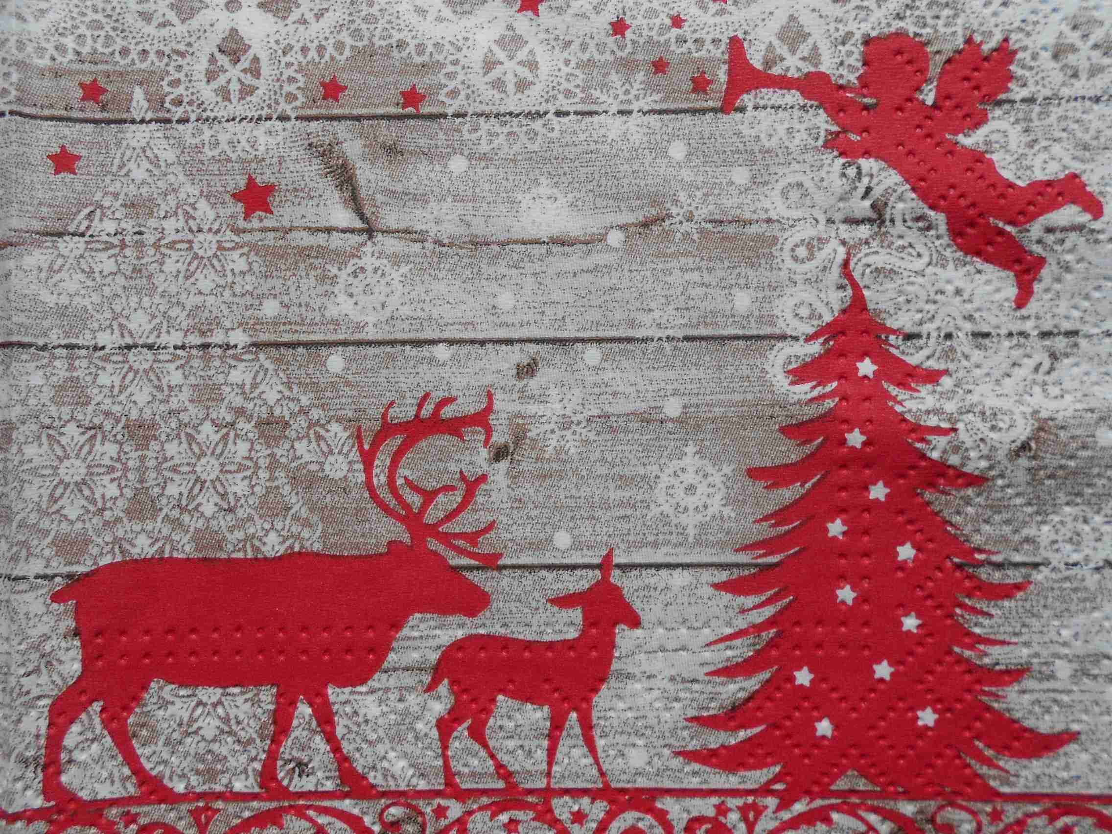 Red Christmas tree, deer and angel, lace decoupage paper napkins. Size Cocktail (25x25cm or 10 x 10 inches), 3 ply, quantity: 1 sheet